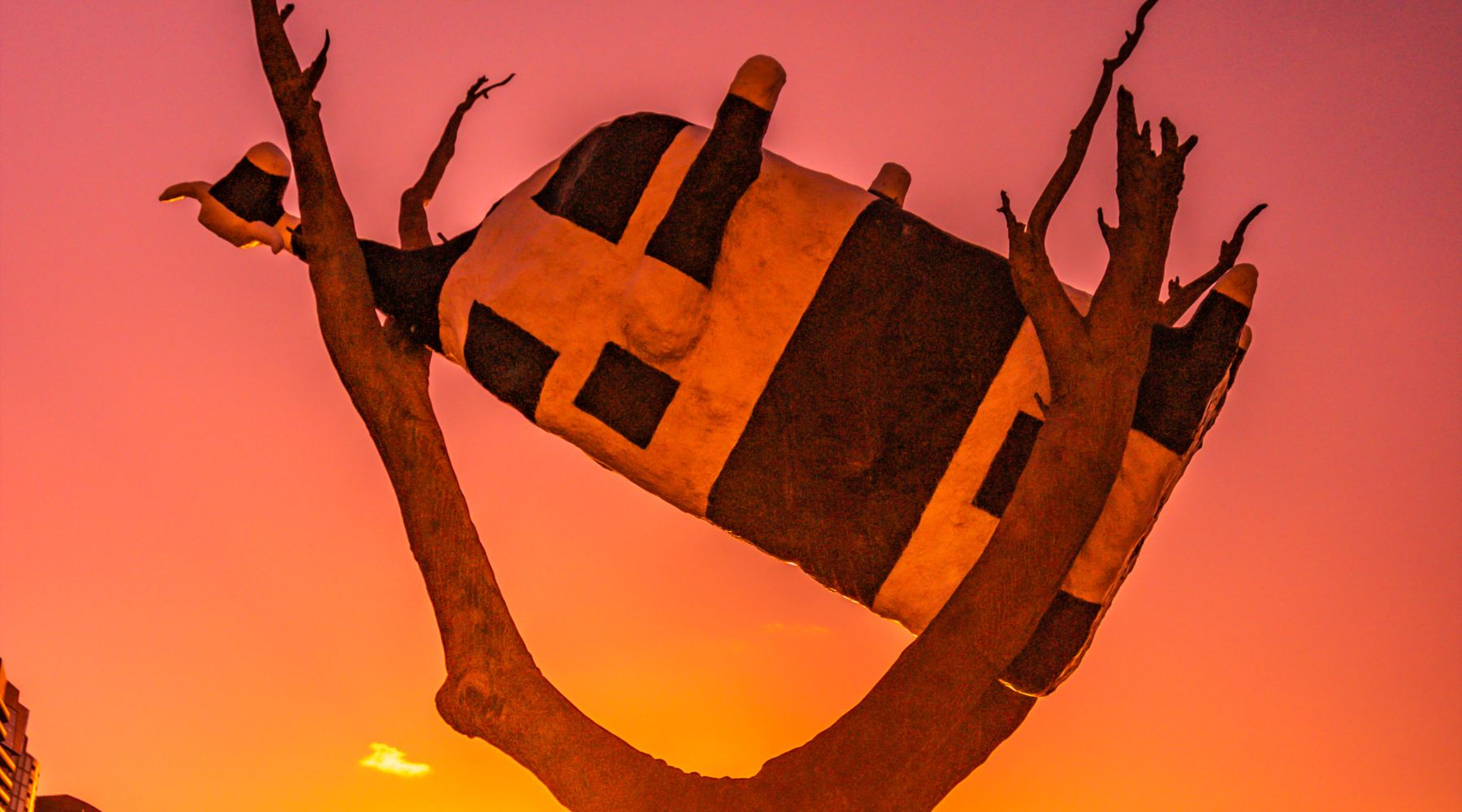 Yes, a literal sculpture of a cow stuck in a tree. It’s an artwork by John Kelly symbolising absurdity and bureaucracy. Visitors either love it or scratch their heads.